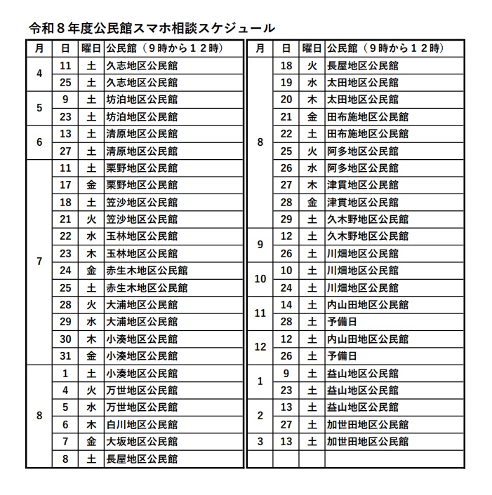 令和8年度ICTカフェ公民館無料講座のお知らせ 2026年4月21日 最終更新日時 : 2026年4月21日 ictcafemsc 本年度より各月2回ほど、各地区公民館にて出張無料講座を実施することになりました。 ふるってご参加ください。なお、予定は表の通りですが変更の可能性もあります。 事前に南さつまシルバー人材センターまでお問合せいただけるとありがたいです。 \ 最新情報をチェック / FacebookXBlueskyHatenaCopy